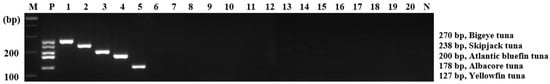 To verify the designed primer’s specificity, single PCR was conducted with the DNA extracted from raw materials. The bigeye, skipjack, Atlantic bluefin, albacore, and yellowfin tuna primers produced amplification products of 270, 238, 200, 178, and 172 base pairs, respectively. The primers did not cross-react with the 15 nontarget species, including common carp, goldfish, Chinese muddy loach, snakehead, Pacific cod, Alaska pollock, Nile tilapia, Pacific saury, Pacific chub mackerel, longtooth grouper, convict grouper, Atlantic salmon, masu salmon, marlin, and sailfish (Figure 1).