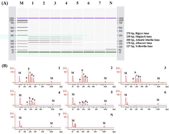 Electropherograms of sensitivity results of the multiplex PCR assay. Gel image (A) and electropherograms (B). FU, fluorescence; M, alignment marker; lanes 1–7, positive gDNA 10, 1, 0.1, 0.01, 0.001, 0.0001, 0.00001 ng; lane N, non-template; a,b,c,d, and e indicate yellowfin tuna, albacore tuna, Atlantic bluefin tuna, skipjack tuna, bigeye tuna respectively.