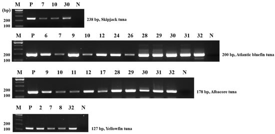 Servusova and Piskata (2021) tested 70 samples and reported 12 products to be mislabeled, and 2 products to be a mixture of two species [22]. Bojolly et al. (2017) tested 10 commercial products labeled with yellowfin tuna, five of which were found to be a mixture of yellowfin and skipjack tunas [24]. Substitutions among tuna species occur during the filleting and can manufacturing processes, leading to inaccurate labels [24]. Additionally, the identification of the species is difficult due to processes such as sterilization, and hence, species other than the marked species may be present. In addition, some Atlantic populations of T. thynnus might exhibit introgression of mitochondrial DNA from T. alalonga [39]. Therefore, some mislabeling involving Atlantic bluefin and albacore tunas could remain undetected [40]. However, with single and multiplex specificity verification, the primers developed in this study can be used as genetic markers for tuna species identification.