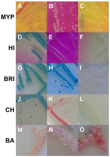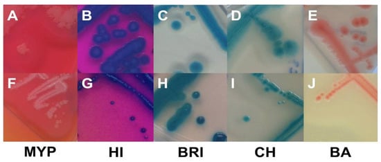 - Fricker, M.; Reissbrodt, R.; Ehling-Schulz, M. Evaluation of standard and new chromogenic selective plating media for isolation and identification of Bacillus cereus. Int. J. Food Microbiol. 2008, 121, 27–34. [Google Scholar] [CrossRef]