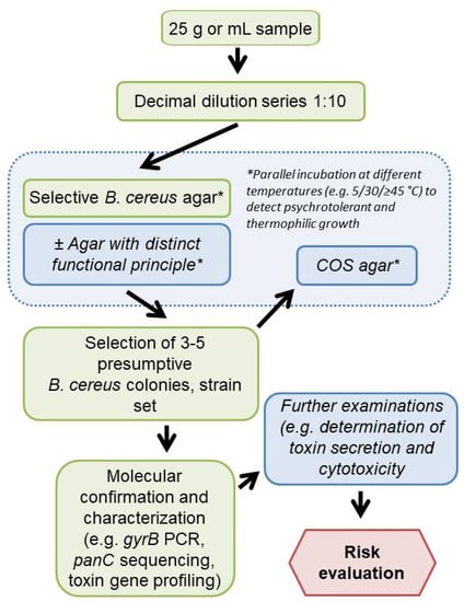 - ISO 7932; Microbiology of Food and Animal Feeding Stuffs-Horizontal Method for the Enumeration of Presumptive Bacillus cereus-Colony-Count Technique at 30 °C. International Organization for Standardization: Geneva, Switzerland, 2004.