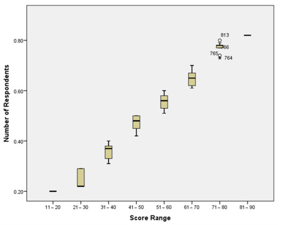 Food safety knowledge and practice scores of the tested seven aspects and the overall score are presented in Table 2. The results indicated that the overall food safety knowledge and practice score among women in Dubai was 19.7 ± 0.1, corresponding to 53%. A box and whisker plot shows the distribution of food safety knowledge and practices score percentage (Figure 1). None of the respondents scored above 90%. The percentage of respondents who scored 21–30, 31–40, 41–50, 51–60, 61–70, 71–80, and 81–90 was 5.2, 13.9, 15.2, 41.7, 16.1, 6.0, and 1.7%, respectively.