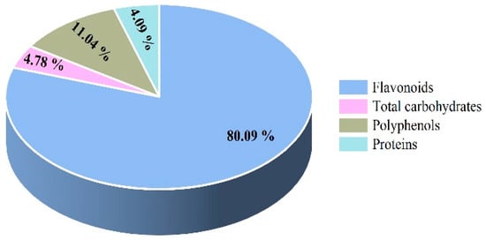 As shown in Figure 1, the contents of flavonoids, total carbohydrates, polyphenols, and proteins in LBFs were 80.09 ± 0.60%, 4.09 ± 0.63%, 11.04 ± 1.25%, and 4.78 ± 0.82%, respectively.