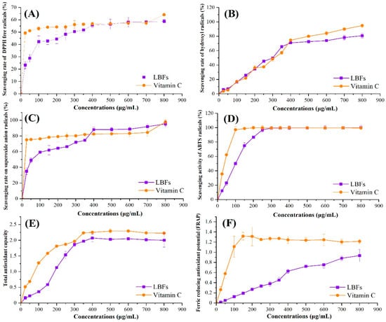 Antioxidant activity is directly and positively correlated with reducing capacity [38]. Reducing capacity is usually related to the existence of reducing ketones, which exert an antioxidant effect by providing hydrogen atoms to break free radical chains. The electron-donating ability of a reducing agent is usually determined by the potassium ferricyanide reduction method [11]. Figure 3E shows the total reducing capacities of LBFs and VC. The total reducing capacities of all samples increased tightly along with the increase in concentration. When the concentration was 400 μg/mL, the total reducing capacities of LBFs and VC were 2.07 ± 0.12 and 2.25 ± 0.03 (p < 0.05), respectively, and remained unchanged with the further increase in concentration.