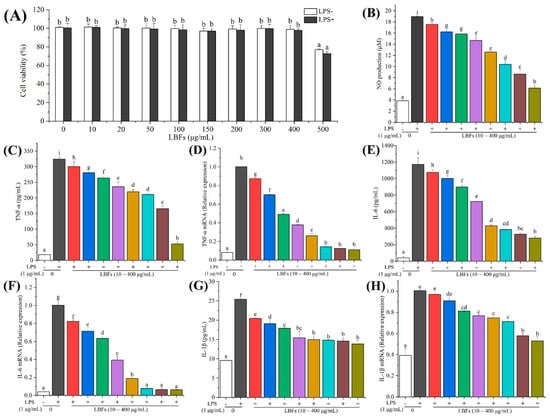 The safety evaluation should be carried out before the development of LBFs for functional foods. Thus, an MTT assay was used to evaluate the effect of LBFs on the viability of RAW264.7 macrophages [29]. In view of the concentration-dependent manner of LBFs in the antioxidant experiment, the cells were pretreated with 10–500 μg/mL of LBFs for 2 h and then treated with 1 μg/mL of LPS for 24 h. As shown in Figure 4A, LBFs at the concentration of 10–400 μg/mL showed limited effect on cell viability with and without the addition of LPS. When the concentration of LBFs was at 500 μg/mL, the cell viability was significantly reduced to 72.71 ± 2.39% (p < 0.05) compared with the blank control. Therefore, LBFs at the concentration of 10–400 μg/mL had no cytotoxicity on RAW264.7 cells, which was used for the subsequent experiments.