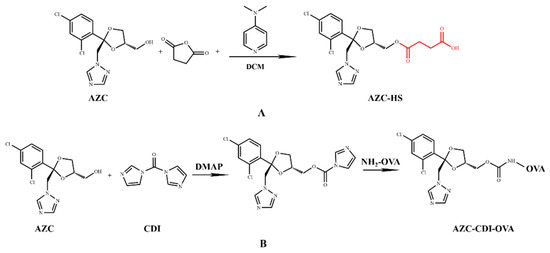 Coating antigens were prepared using a CDI method [28], OVA was used as the carrier (Figure 1B). Briefly, 110 mg of AZC was dissolved in 3 mL of DMF. Then, 15 mg of CDI and 5 mg of DMAP were added with stirring at room temperature for 24 h. After that, the mixture was added to dropwise to a reaction flask containing OVA (10 mg/mL, 1 mL), and was stirred at 4 °C for 12 h. The reactive mixture was also dialyzed against PBS (0.01 M, pH 7.4) at 4 °C for 3 days. The dialyzed product was the coating antigen (AZC-CDI-OVA) (Figure S2B) and confirmed by UV-Vis scan as above before being stored at −20 °C until use.