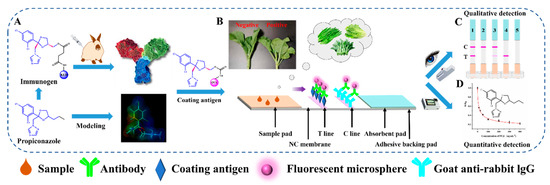 Methods for detecting propiconazole include gas chromatography (GC) [15,16], high-performance liquid chromatography (HPLC) [17,18], gas chromatography-tandem mass spectrometry (GC-MS/MS) [19,20], and liquid chromatography-tandem mass spectrometry (LC-MS/MS) [21,22]. These methods are widely used due to their advantages in sensitivity and accuracy [23]. However, they are complex, require professionals to operate, and are time- and cost-sensitive [24]. The immunoassay has become the most important part of the rapid detection field because of its time-saving, high sensitivity, and simple operation [24]. Until now, there are limited reported immunoassays for propiconazole detection, mainly colloidal gold immunochromatographic assay (CG-ICA) [25] and indirect competitive enzyme-linked immunosorbent assay (ic ELISA) [26]. Nevertheless, the ELISA method requires laboratory conditions and tedious washing steps. In order to establish a highly sensitive as well as convenient propiconazole immunoassay, fluorescent microspheres-based immunochromatography has great potential.