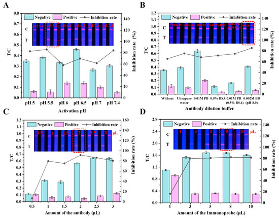Optimization of working conditions. All the optimize conditions were evaluated by the negative (0 ng/mL) and positive (100 ng/mL). The values of T/C below were calculated from the pictures above by FIC-Q1 fluorescence reader and the screening criteria combined the T/C value, where B and B0 were the ratio of T/C values with and without propiconazole in the sample solutions. Inhibition rate is equal to 1-B0/B. (A) Activation pH, (B) Antibody dilution buffer, (C) Antibody amount, (D) Immunoprobe amount.