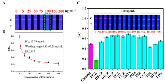 To further improve the detection performance, ion concentration of standard diluent, methanol content in diluent, coupling pH, time of coupling reaction, and blocking time were optimized in this investigation, too (Figure S4A–E). All optimized conditions are summarized in Table 1. The screening criteria combined the T/C value, where B and B0 are the ratio of T/C values with and without propiconazole in the sample solutions.