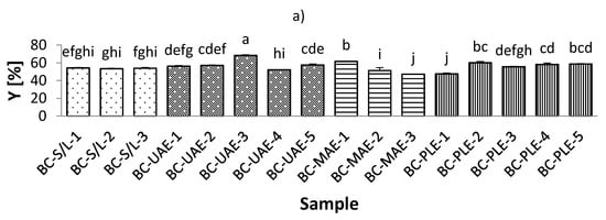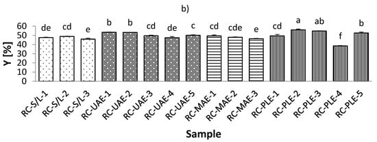 Total extraction yield (Y) of black (a) and red (b) currant extracts obtained by conventional and sustainable extraction techniques. RC—red currant extract; S/L—conventional solvent extraction, UAE—ultrasound-assisted extraction; MAE—microwave-assisted extraction; PLE—pressurized-liquid extraction. Results are expressed as mean ± standard deviation (SD). Tukey’s multiple comparison test was performed at p < 0.05, and different letters represent statistically significant differences among samples.