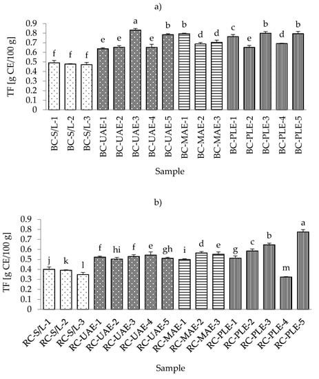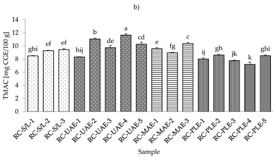 Total phenolic content (TPC) of black (a) and red (b) currant extracts obtained by conventional and sustainable extraction techniques. RC—red currant extract; S/L—conventional solvent extraction, UAE—ultrasound-assisted extraction; MAE—microwave-assisted extraction; PLE—pressurized-liquid extraction. Results are expressed as mean ± standard deviation (SD). Tukey’s multiple comparison test was performed at p < 0.05, and different letters represent statistically significant differences among samples.