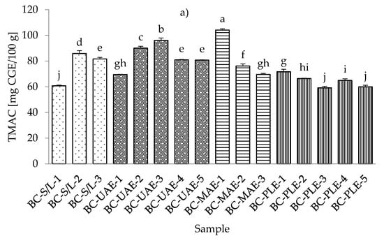 Regarding the influence of different ethanol concentrations, it was found that lower concentrations gave lower TMACs in black currant extracts in the case of S/L and UAE. In the case of UAE extracts, it was also found that higher TMACs were obtained at higher ethanol concentrations. In the case of MAE and PLE extracts of black currant, lower ethanol concentrations gave higher TMACs and vice versa; higher ethanol concentrations generated lower TMACs. For red currant extracts, lower ethanol concentrations generated lower TMACs in S/L red currant and UAE, while higher ethanol concentrations caused higher TMACs in red currant for S/L extracts.