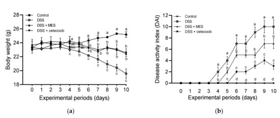 DSS-fed mice present distinct symptoms of colitis, including body weight loss, colon shortening, bloody diarrhea, disruption of epithelial barrier, destruction of crypt, and infiltration of inflammatory cells [46]. Our results demonstrate that many of the symptoms were effectively alleviated by the supplementation of MES. The effect of MES at 12 mg/kg was comparable to celecoxib at 10 mg/kg. As a selective inhibitor of COX-2, celecoxib is prescribed for the management of pain and inflammatory disorders [29,47], and was used as a positive control in the present study.