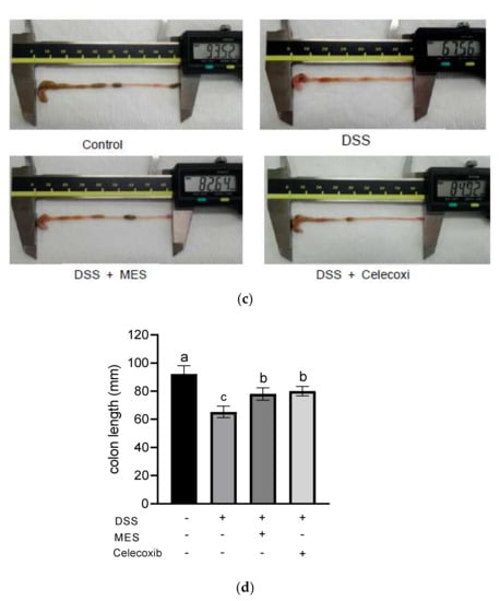 All mouse studies were accomplished with the guidelines of the Korean National Institute of Health Guide for the Care and Use of Laboratory Animals, and were approved by the Animal Ethics Committee of Pukyong National University. Six week-old BALB/c male mice were purchased from Central Lab Animal Inc. (Gyeonggido, Korea). After one week of acclimation, mice (n = 8 per group) were randomly assigned to four groups: (1) control, (2) DSS, (3) DSS + MES (12 mg/kg body weight), and (4) DSS + celecoxib (10 mg/kg body weight) (Figure 1). Colitis was induced through drinking water containing 4% (w/v) DSS. The mice received either regular drinking water (control group) or 4% DSS drinking water (the other three groups) for 7 days and thereafter all mice were provided with regular drinking water for 3 days. Celecoxib, a cyclooxygenase-2 (COX-2) selective inhibitor, significantly ameliorated colitis in various animal models, and therefore was used as a positive control [28,29,30,31]. All the mice were fed with an AIN-93G purified diet. During the 10-day course, the DSS + MES group mice were given MES (12 mg/kg BW), and DSS + celecoxib group mice were given celecoxib (10 mg/kg BW) via oral gavage on a daily basis. Control and DSS groups were given an equal volume of 20% propylene glycol. After one day of fasting, all mice were sacrificed by cervical dislocation. The intake amount of MES was determined based on our previous study, which observed a strong anti-inflammatory effect of both 12 mg MES/kg BW and 24 mg MES/kg BW on lipopolysaccharide-stimulated mice [32]. The difference between 12 mg MES/kg BW and 24 mg MES/kg BW was not significant. Therefore, we hypothesized that 12 mg/kg MES may exert anti-inflammatory effect in DSS-induced colitis mice.