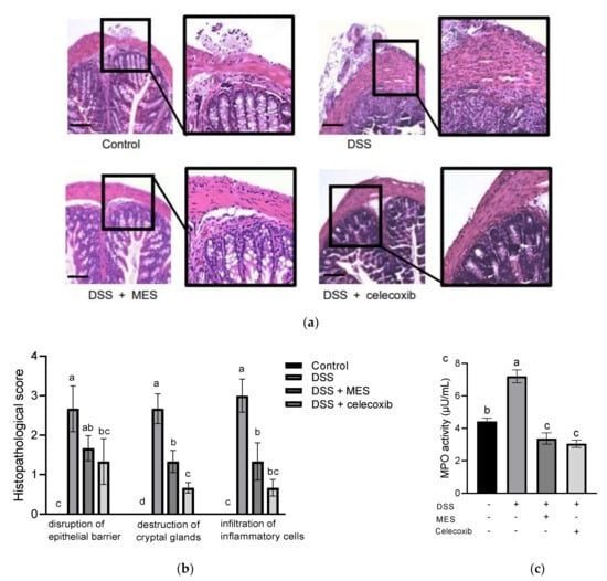 DSS-treated mice exhibited pronounced histological changes, such as disruption of the epithelial barrier, destruction of cryptal glands structure, and infiltration of inflammatory cells (Figure 3a). MES and celecoxib supplementations significantly ameliorated these damages. In addition, quantified histological scores from MES and celecoxib groups were significantly lower than those of the DSS group (Figure 3b).