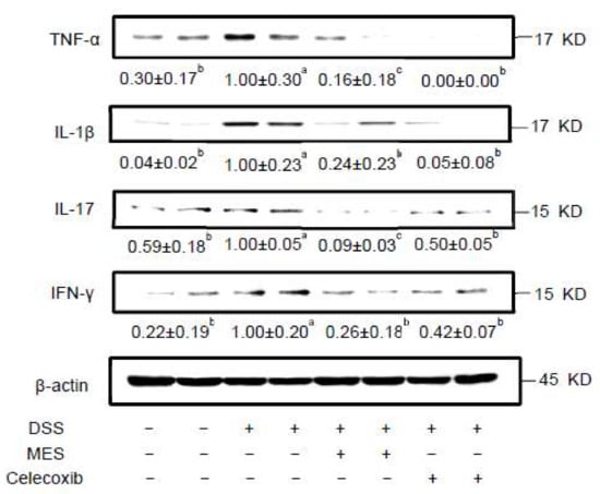 MES supplementation suppresses levels of pro-inflammatory cytokines in colon of DSS induced colitis mice. Protein levels of TNF-α, IL-1β, IL-17 and IFN-γ were determined by Western Blot. All data are expressed as mean ± SD. Bars with no common letters are significantly different (p < 0.05). DSS: dextran sulfate sodium; MES: meroterpenoid-rich ethanoic extract of a brown algae, Sargassum macrocarpum.
