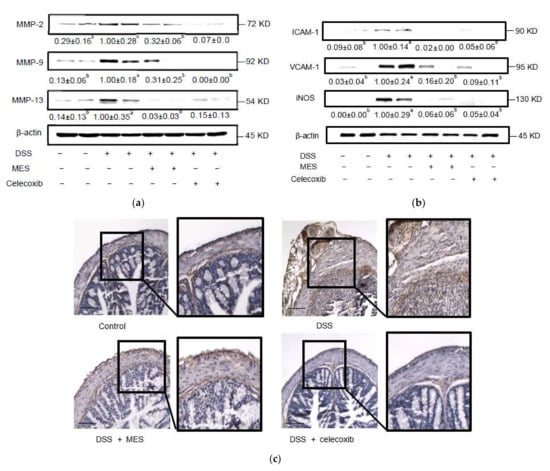 The overexpression of inflammatory-related proteins, MMP-2, MMP-9 and MMP-13 has been reported to be involved in colon damage during colitis [37]. DSS exposure significantly elevated MMP-2, MMP-9 and MMP-13 expressions in colon, however, MES and celecoxib strongly attenuated their production (Figure 5a).