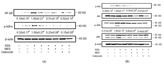 MAPKs (e.g., ERK, JNK and p38 MAPK) and Akt have been implicated in the regulation and release of pro-inflammatory cytokines in the course of UC [26,39]. DSS treatment resulted in a marked increase of the phosphorylation of Akt and JNK (Figure 6b), but not ERK and p38 MAPK (data not shown). Treatment with MES and celecoxib strongly suppressed the phosphorylation of Akt and JNK.