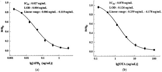 The inhibition curve of ic-ELISA: (a) AFB1; (b) OTA.