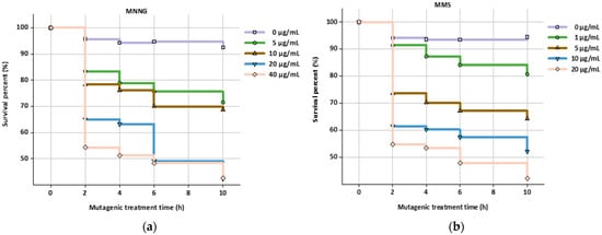 Effects of mutagen concentration and mutagenic treatment time on survival percentage (%) of the hybridoma cell line. (a) AFB1 hybridoma cell line E4; (b) OTA hybridoma cell line B3.