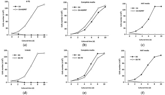 After MNNG mutation treatment, the E4 cells were inoculated in 6-TG medium for selective screening. The screened E4-HGPRT− cell line gradually formed colonies with the ability to fission and grow. Finally, stable inherited deficient cells E4-HGPRT− were obtained. Similarly, stable inherited deficient cells B3-TK− were screened in 5-BrdU. Figure 3 depict the growth curves of E4-HGPRT− and B3-TK− in screening reagent (6-TG and 5-BrdU), complete media and HAT media after mutagenic treatment. The unmutated cells could not survive in screening reagent (Figure 3a,d). In complete medium culture, both normal cell line and mutant could grow normally (Figure 3b,e). The cell apoptosis in HAT medium was adopted as an indication of HGPRT or TK deficiency. The growth curve (Figure 3c,f) shows that E4-HGPRT− and B3-TK− were unable to divide in HAT media, which indicates that E4-HGPRT− and B3-TK− were sensitive to HAT media.
