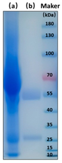 E4-HGPRT− and B3-TK− were fused by hybrid-hybridoma technology. A total of 83 tetradoma colonies were generated, and the cell supernatant was identified by ELISA. After 3–4 rounds of subcloning, a positive tetradoma T26 was chosen and was used for production of anti-AFB1/OTA BsMAb by induction in vivo. Clear bands of heavy chain (about 55 kDa) and light chain (about 25 kDa) from BsMAb were observed in the electropherogram (Figure 4). The concentration of BsMAb was 9.61 mg/mL measured by NanoDrop ultraviolet spectrophotometer.