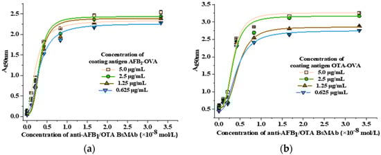 The affinity constant (Ka) at different coating concentrations was confirmed by ELISA and shown in Figure 5. The average Ka of the BsMAb to AFB1 and OTA were 2.43 × 108 L/mol, and 1.57 × 108 L/mol, respectively. Previous studies indicated that the affinity constant (Ka) of high affinity antibodies is between 107 L/mol–1012 L/mol [48], suggesting that the BsMAb prepared in this study is a high affinity antibody.