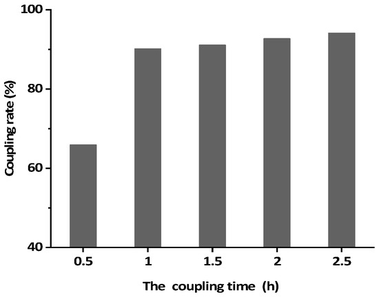 While anti-AFB1/OTA BsMAb was coupling with CNBr-Sepharose 4B, the concentration of antibody in the supernatant of the coupling solution was determined every 0.5 h, and the coupling efficiency was calculated to determine the optimal coupling time. Figure 6 shows that the coupling rate rapidly increased to 90.1% for 1 h and the increase in speed over 1 h became slower. Thus 1 h was selected as the optimal coupling time.