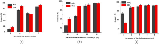 Optimization results of the IAC elution conditions: (a) the recovery of AFB1 and OTA with different kind of elution solution (n = 3); (b) the recovery of AFB1 and OTA with different ratios of methanol–water as elution solution (n = 3); (c) The recovery of AFB1 and OTA with different elution volume (n = 3).