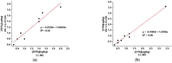 Eight real samples of corn and wheat were simultaneously analyzed by the established IAC-ELISA and LC-MS. The results are shown in Figure 8. AFB1 and OTA both tested positive in the eight samples, but the levels were all below the maximum levels. The correlations between the detection results and LC-MS were both above 0.9. Thus it can be seen that the established IAC-ELISA could be applied to the detection of AFB1 and OTA simultaneously in real corn and wheat samples with high accuracy.