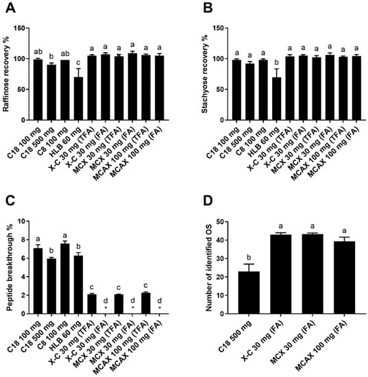 Recovery of raffinose (A) and stachyose (B), breakthrough of peptides (C), and number of oligosaccharides (OS) identified with MS/MS confirmation (D) of the aqueous fractions collected from different SPEs loaded with the proteolyzed almond extract. The asterisks indicate cases where the peptide breakthrough was lower than the detection limit (0.8%). Reverse-phase SPE (C18 100 mg, C18 500 mg, C8 100 mg, and HLB 60 mg) was conducted using TFA as a modifier. Mixed-mode SPE cartridges (X-C 30 mg, MCX 30 mg, and MCAX 30 mg) were eluted with either 0.1% TFA in water or 0.1% formic acid (FA) in water. Data are presented as mean ± standard deviation (n = 3). Different lowercase letters represent a significant difference at p < 0.05.