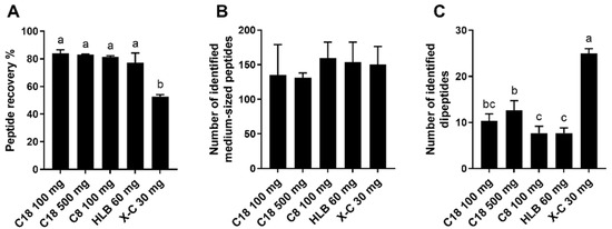 The advancement of liquid chromatography-mass spectrometry (LC-MS) and automated data analysis enables the profiling of hundreds of peptides in a sample in only one run and is now widely used in bottom-up proteomics. To avoid ion suppression and ensure data quality in LC-MS analysis, appropriate sample preparation to eliminate interfering substances from complex food materials is indispensable and is regularly fulfilled with reversed-phase solid-phase extraction (SPE) [10,11]. Reverse-phase SPE can separate salts and low-molecular-weight carbohydrates (i.e., simple sugars and oligosaccharides) from peptides because only peptides are retained through the hydrophobic interaction. However, some small peptides, specifically di- and tripeptides, tend to pass through reverse-phase SPE with aqueous eluent and are not recovered in the final peptide eluate [14,15].