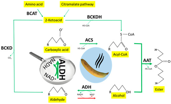 Role of aldehyde dehydrogenase (ALDH) in the dehydrogenation from aldehydes to carboxylic acids and the entire ester production pathways. ADH, alcohol dehydrogenase; ACS, acyl-CoA synthetase; AAT, alcohol acyl-CoA transferase; BCAT, branched-chain amino transferase; BCKD, branched-chain α-ketoacid decarboxylase; BCKDH, branched-chain α-ketoacid dehydrogenase.