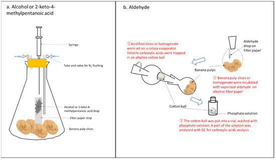 When feeding experiments were conducted by incubating 10 g of banana pulp slices with 50 µmol of exogenous C2–C6 straight chain or branched aldehydes, the incubation conditions were similar to Section 2.3.1 (Figure 2a,b). Due to the targeted products being carboxylic acids, specific procedures were applied as Figure 2b. Filter paper strips treated with NaOH (1 M) were dried before spotting exogenous substrate aldehydes to remove any possible acid impurities in the substrate aldehydes. A recovery flask (250-mL) was used for the incubation. After incubation, the pulp slices were well soaked with 1.5 mL of phosphoric acid (0.4 M) in the flask. Then, the flask was attached to a rotary evaporator in which a cotton ball was inserted at back-flow prevention glass wear. The cotton ball for the acid trap was previously treated with NaOH (0.1 M) and dried. After rotary evaporation (40 °C for 60 min), the cotton ball was put into a 17 mL vial and then mixed well with 5 mL of phosphoric acid (0.4 M). For ethanoic acid measurement, 5 mL of acidified ether was used instead of the phosphoric acid solution. For the phosphoric acid solution with carboxylic acids, 1 µL was injected into GC to determine the targeted carboxylic acids (Figure 2b). The GC conditions were: a glass column (3 m × 3 mm) of SP1200 (10%) + phosphoric acid (1%), and oven temperature 60–120 °C depending on molecular weight of the target acid. The recovery rate of this method was 53.3% ± 3.2 for ethanoic acid, 81.4% ± 4.7 for propanoic acid, 92.6 ± 1.6 for 2-methylpropanoic acid, 95.6 ± 6.1 for butanoic acid, 97.2% ± 7.4 for 3-methylbutanoic acid, 94.9% ± 7.2 for pentanoic acid, and 97.6% ± 1.3 for hexanoic acid (n = 3).