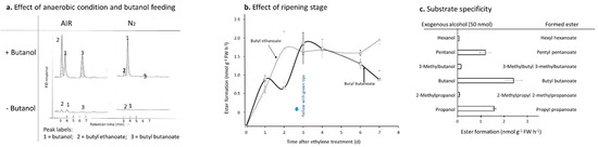 When butanol vapor was fed to banana pulp slices (at the “yellow with green tips” stage), butyl ethanoate as well as butyl butanoate were accumulated (Figure 3a). Under anaerobic conditions, those esters were barely accumulated (Figure 3a). Green banana (immediately after ripening was triggered by ethylene) pulp was not able to biosynthesize such esters, but obtained the capacity within one day (Figure 3b). Butyl butanoate production increased continually until the “yellow with green tips” stage (day 3 after ethylene treatment), then gradually declined toward senescence (Figure 3b). Similarly, feeding butanol to fruit pulp of ripe muskmelon, pineapple, pawpaw, strawberry, European pear, and apple, also produced butyl butanoate (data not shown). Figure 3a,b results were confirmed when incubating a banana finger in a 1 L jar with butanol vapor, with a much lower yield (about 20%) of butyl butanoate in comparison to that of pulp slices (data not shown). When feeding other C3–C6 branched or straight chain alcohols to banana pulp instead of butanol, propyl propionate and pentyl pentanoate were produced in comparable amounts to butyl butanoate, but productions of hexyl hexanoate, 3-methylbutyl 3-methylbutanoate, and 2-methylpropyl 2-methylpropanoate were much lower (Figure 3c).