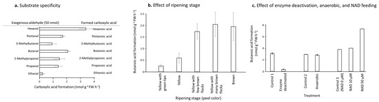 Aldehyde feeding experiments and production of corresponding carbolic acids in banana pulps. Exogenous aldehyde (50 µmol) on filter paper was fed into 10 g of banana pulp tissues. (a) Substrate specificity of C2–C6 branched and straight chain aldehydes at the “yellow with green tips” stage (banana pulp slices); (b) Effect of ripening stage (pulp homogenate); (c) Effects of enzyme deactivation by heat, anaerobic incubation, and feeding of NAD+ at different levels (pulp homogenate). Vertical/horizontal line at each column shows average ± SD (n = 3).