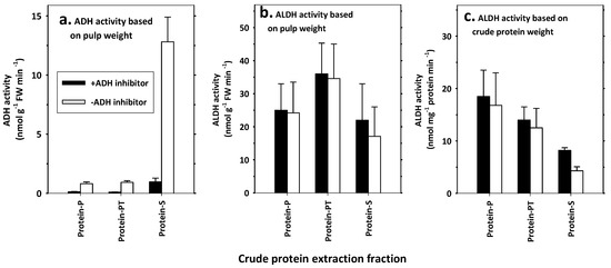 As shown in materials and methods, crude proteins were extracted in three ways: from supernatant (protein-S), or from pellets by sonication-assisted extraction with or without Triton X-100 (protein-PT and protein-P, respectively). The protein-S possessed more than 95% of ADH activity, while both protein-P and protein-PT had very little ADH activity (Figure 5a). On the other hand, ALDH activity was evidenced in all protein extractions (Figure 5b,c).