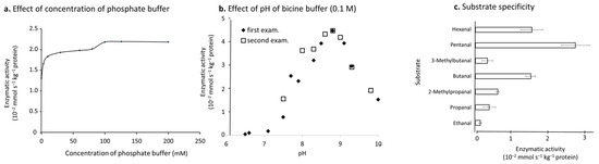 Activity of crude ALDH. (a) Optimum concentration of phosphate buffer; (b) Optimum pH; and (c) Substrate specificity to C2–C6 branched and straight chain aldehydes. Horizontal line at each column shows average ± SD (n = 3).