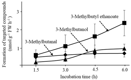 Formation of 3-methylbutanol, 3-methylbutanal and 3-methylbutyl ethanoate from exogenous 2-keto-4-methylpentanoic acid (50 nmol) after incubation with pulp slices (10 g) of bananas at the “yellow with green tips” stage. Vertical line at each marker shows average ± standard deviation (n = 3).