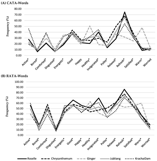 Emotion and wellness profiles of five herbal drinks from the (A) Rating-Words (score 1–5; n = 209) and (B) RATA-Words (score 0–5; n = 208) questionnaires. * indicates significant differences among the five herbal drinks (p < 0.05).