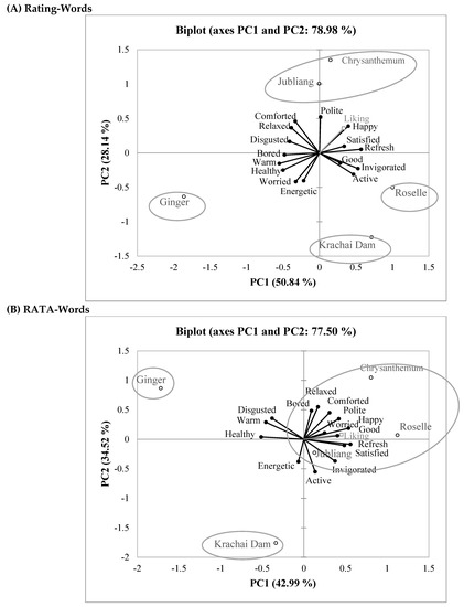 PCA biplots of emotion and wellness responses of the five herbal drinks in the (A) Rating-Words and (B) RATA-Words questionnaires. Symbols (○) and (●) indicate the position of herbal drinks and emotion-wellness terms, respectively.
