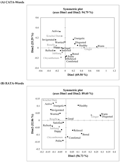 CATA and RATA frequency counts were analyzed following the recommendation of Meyners et al. (2016) [27]. Cochran’s Q test was carried out to determine the differences among herbal drink samples for each emotion or wellness response, and the sign test was used for pairwise comparison. Correspondence analysis (CA) based on Chi-square distances was used to identify the emotion and wellness terms that correlated to overall differences among the sampled herbal drinks. DA was performed to identify the important terms of group discrimination.
