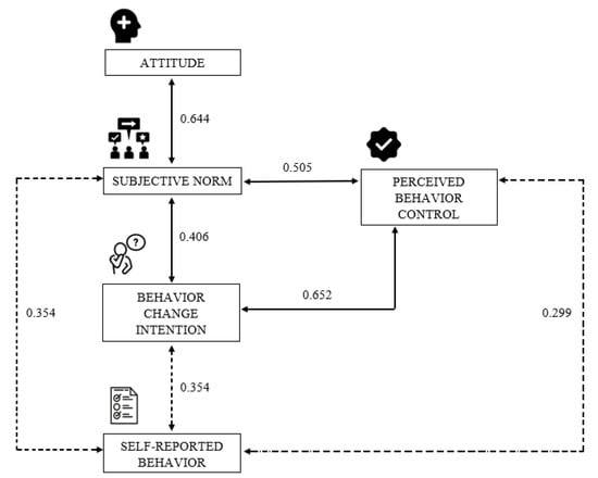 After the individual analysis of the TPB constructs, behavior change intentions, and self-reported safe food practice behaviors, this study presents how the three constructs are associated with one another. Overall, the three independent constructs (attitudes toward the behavior, PBC, and subjective norms) of the TPB give an idea of the drivers toward the behavior change intentions, and, hence, the self-reported safe food practice behaviors. A Spearman correlation showed a significant relationship between the attitudes toward the behavior, PBC, subjective norms, the behavior change intentions, and the self-reported safe food practice behavior among participants (Figure 1). The two constructs with a significant correlation with the behavior change intentions and the self-reported safe food practice behaviors were the PBC and the subjective norms. As shown in Figure 1, both constructs observed a moderate positive correlation with the behavior change intentions while a weak positive correlation with the self-reported safe food practice behavior.