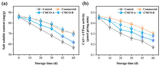 Effects of CMCO on salt-soluble protein content (a) and Ca2+-ATPase activity (b) of MP at different storage time.