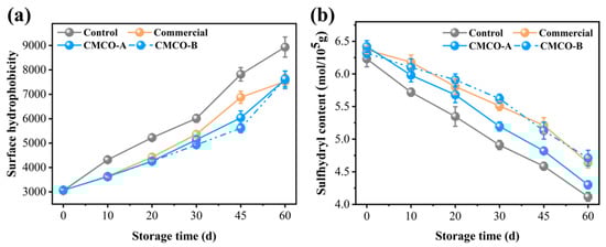 Variations of surface hydrophobicity reflect conformational changes of MP at different physical and chemical states. A reduced surface hydrophobicity suggests that the protein was less denatured (unfolded), and less hydrophobic groups were exposed, thus limiting the protein binding with the fluorescence probe [7]. As depicted in Figure 2a, surface hydrophobicity of the control group increased significantly from 3000 to 8800 after 60 days of storage. This phenomenon was reasonably due to the freezing-induced MP denaturation. Ice crystals that formed in surimi destroyed the hydration layer around the peptides, which resulted in more exposed hydrophobic amino acid residues and higher protein surface hydrophobicity [7]. In the presence of CMCO-A, -B and commercial additive, the surface hydrophobicity of MP was lower than that of the control group, suggesting their cryoprotective effects on protein structures. CMCO, an ampholytic saccharide with strong polarity, may interact with proteins and increase their hydrophilicities. Consequently, undesirable protein aggregation was inhibited as evidenced by the reduced hydrophobic interaction [38].
