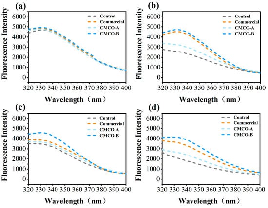 Effects of CMCO on fluorescence intensity of MP at different storage time: (a) day 0, (b) day 15, (c) day 30, and (d) day 60.