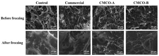 A porous protein network is formed during the two-stage thermal processing of surimi, which determines many important quality attributes of the gel products, such as texture, shelf life and digestion etc. [42,43]. Therefore, SEM was applied to observe the microstructure of gels prepared from frozen surimi. As shown in Figure 4, all gel samples of fresh surimi exhibited reticular and continuous protein network. After frozen storage, the gel matrix became loose for the control group, seen from the increase of heterogenic pore sizes. In contrast, the addition of cryoprotectants alleviated the breakdown of honeycomb-like network of surimi gels, which were beneficial to the mechanical strength of gel matrix. Besides, a more continuous and ordered protein architecture was observed for surimi gel of the CMCO-B group than that of the CMCO-A. A similar phenomenon was also reported by Tan et al. [13], who investigated the gel morphology of frozen surimi treated by cellulosic oligosaccharide.