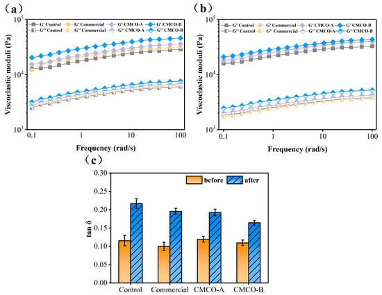 The rheological properties of surimi gels also changed significantly as the MP became denatured during frozen storage. As shown in Figure 5a,b, the elastic moduli (G’) of all surimi gels were higher than those of the viscous moduli (G”) at both day 0 and day 60, indicating their solidlike behaviors. To better illustrate the gel characteristics, loss tangents (tan δ) of surimi gels during frequency sweep were recorded (Figure 5c). The reduced elasticities were observed for all groups of surimi gels, as evidenced by their ever-increased tan δ (i.e., less elastic) after freezing storage. These results were correlated with the formed heterogeneous gel networks prepared from the stored surimi (Figure 4). In the cases of cryoprotected surimi, their gel structures were maintained, thus exhibiting lower tan δ compared to the control. After 60 days, the lowest tan δ was obtained for the CMCO-B group at 0.16. These observations were in consistent with the effect of antifreeze proteins on rheological properties of the frozen surimi [33,42].