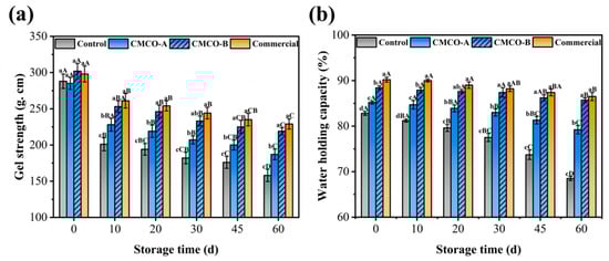 Effects of CMCO on the mechanical strength (a) and water-holding capacity (b) of the gels prepared from frozen surimi at different storage time. Values with different uppercase letters indicate statistically significant difference among samples with different cryoprotectants at the same storage time (p < 0.05). Values with different lowercase letters indicate significant difference among samples with the same cryoprotectants at different storage time (p < 0.05).