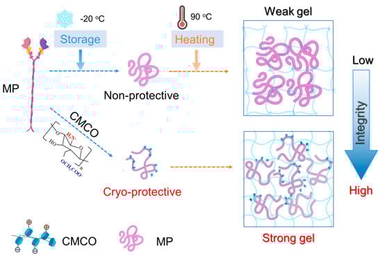 Schematic representation of the cryoprotective mechanism of CMCO for MP in frozen surimi.